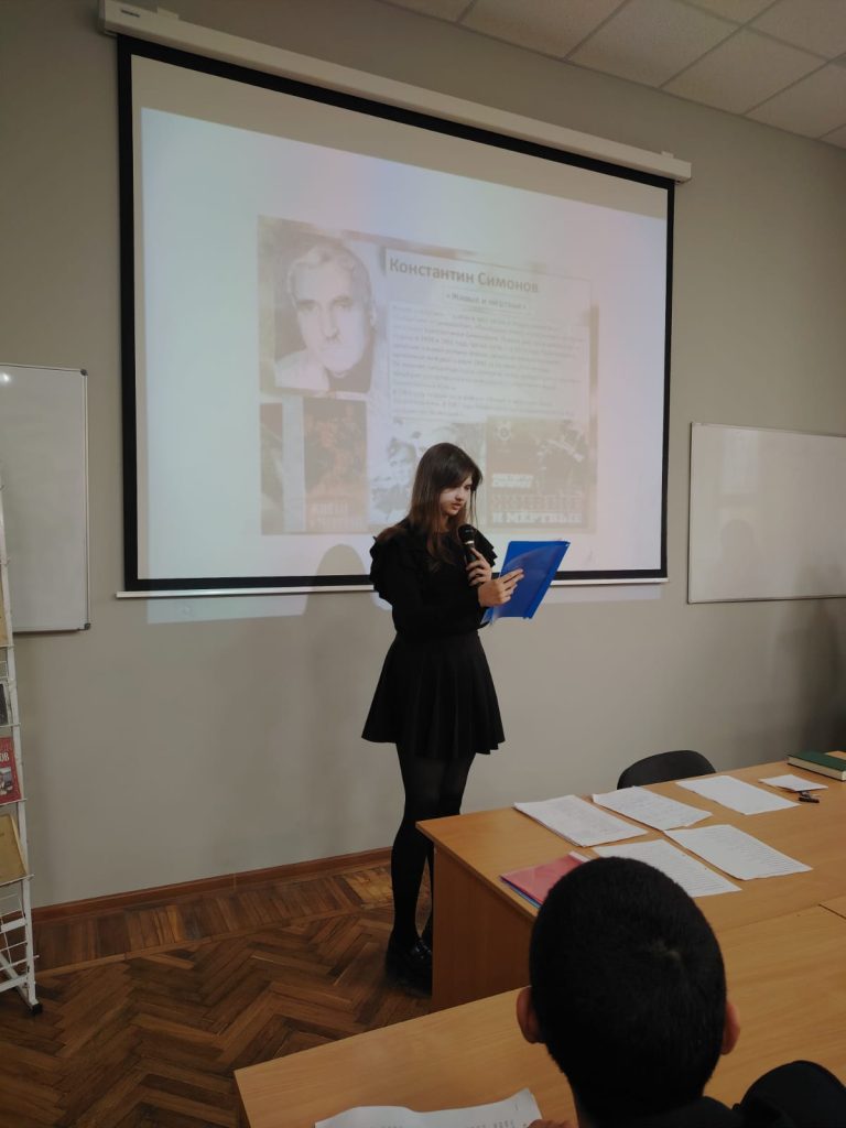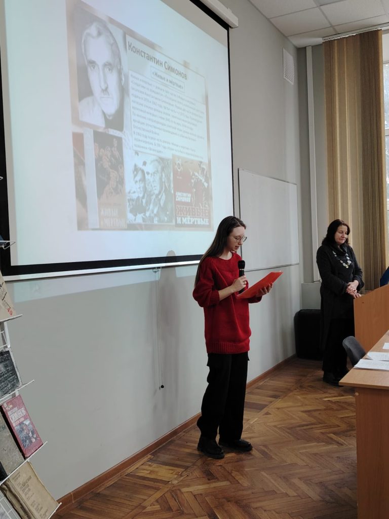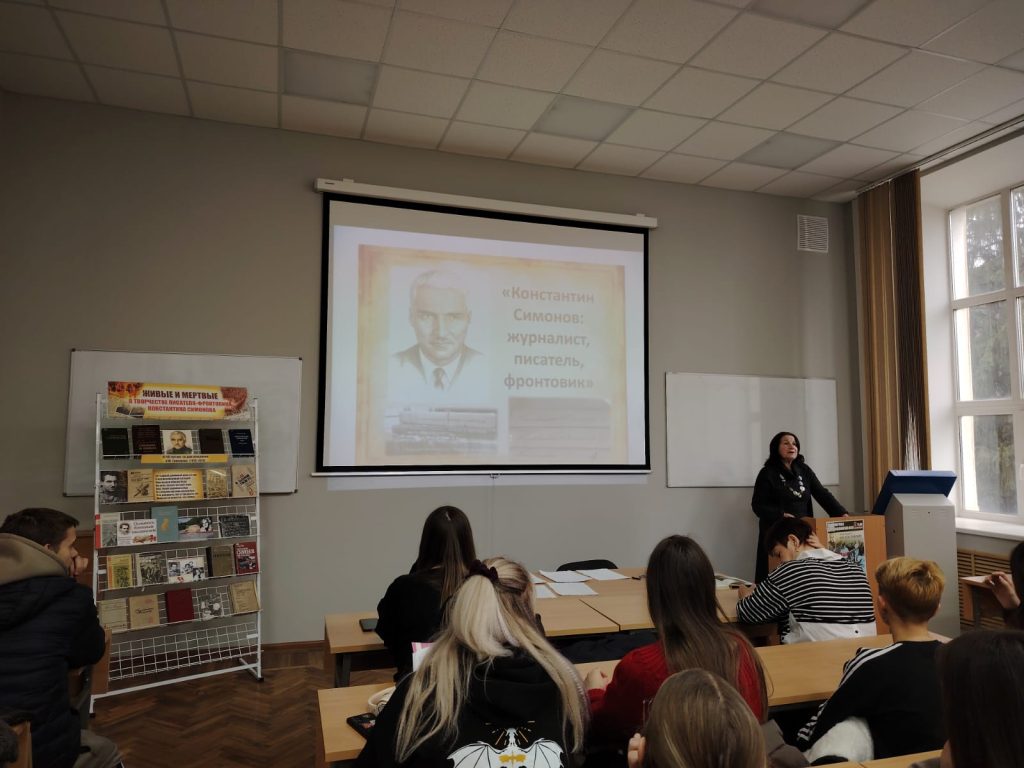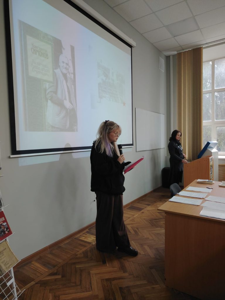 2 декабря 2025 года Научная библиотека провела библиотечную гостиную «Живые и мертвые в творчестве писателя-фронтовика Константина Симонова», на которой присутствовали обучающиеся 1 курса отделения СПО – более 70 человек.