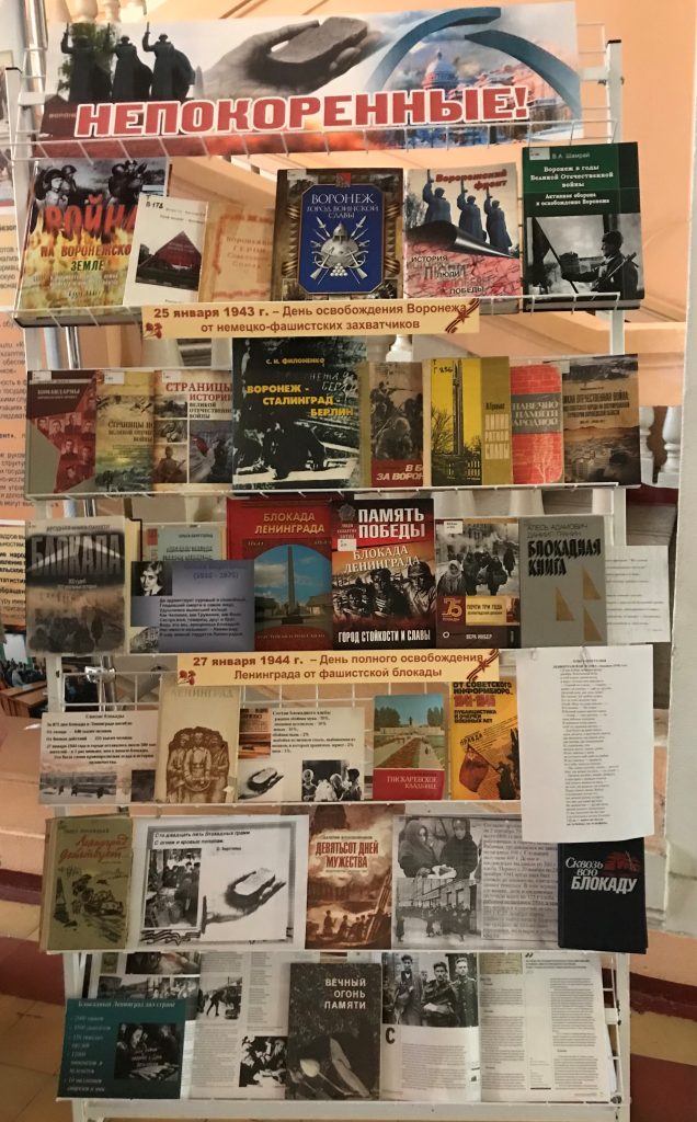 29 января в Воронежском ГАУ прошли мероприятия ко дню освобождения Воронежа и акция «Блокадный хлеб». Библиотека представила выставку «Непокоренные», посвященную Дню освобождения Воронежа от немецко-фашистских захватчиков и Дню полного освобождения Ленинграда от фашистской блокады.