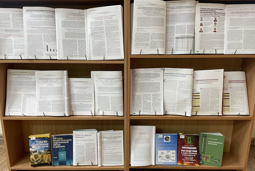 Экспонируются учебные пособия по сельскохозяйственной радиологии, радиационной экологии, охране труда; научные статьи из журналов; книги и сборники конференций.