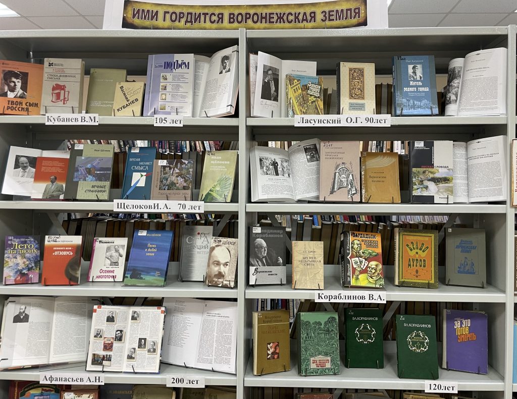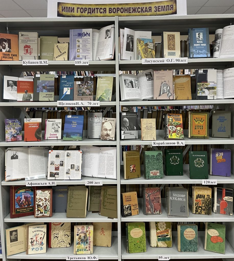На тематической выставке «Ими гордится Воронежская земля» представлены книги и литература о творчестве воронежских писателей-юбиляров 2026 года.